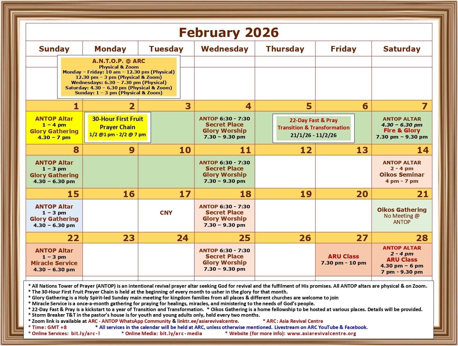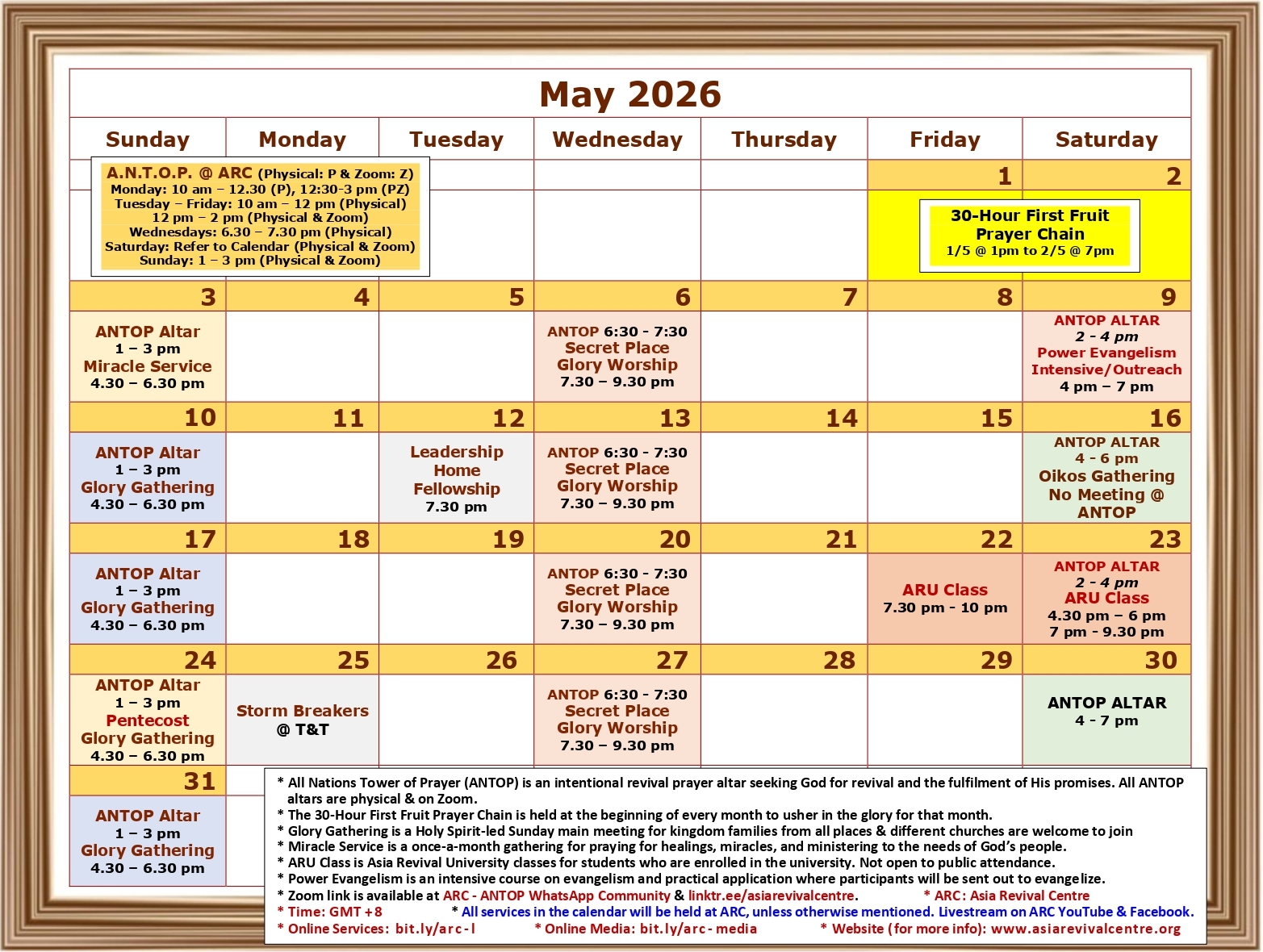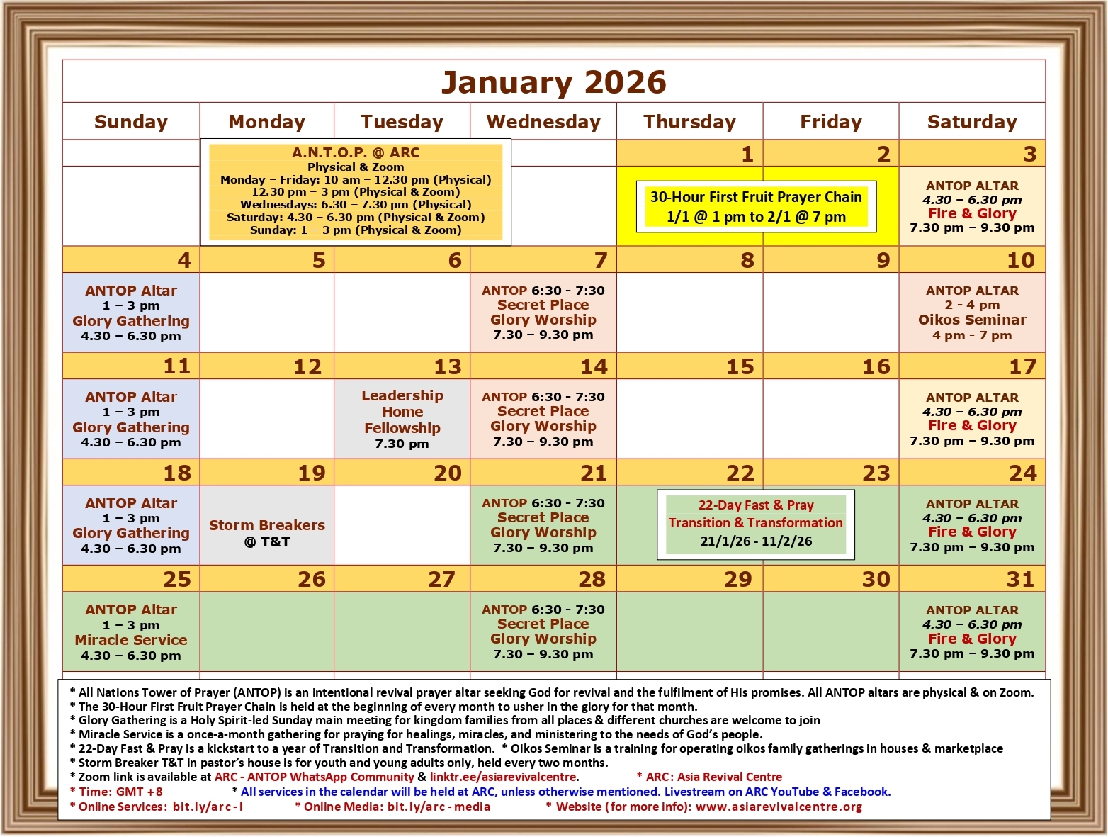 All services in the calendars below will be held at Asia Revival Centre (@ARC) unless where stated. Time Zone: GMT +8.